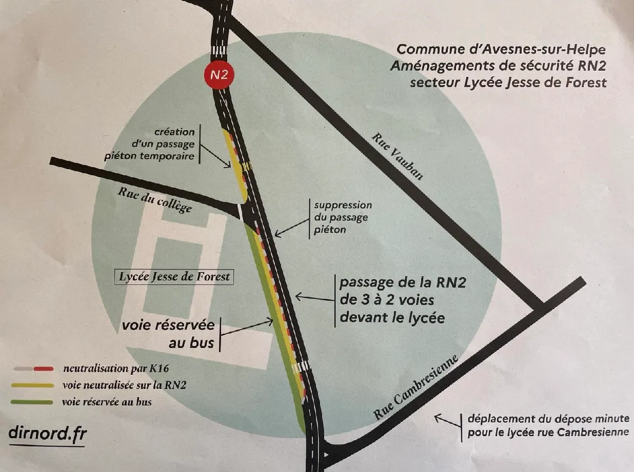 Patrick Van Wynendaele, le proviseur du lycée Jessé-de-Forest, a rappelé que son établissement est fréquenté par plus de 900 élèves et que plus de 11 000 véhicules passent tous les jour devant le lycée. Pour lui et Solveig Massé, la responsable de la gestion des routes à la DIR Nord : « cette neutralisation de la voie côté lycée est la seule solution pour éviter que des véhicules arrêtés sur la voie de droite puissent constituer une masque d’invisibilité pour les piétons, voitures et camions arrivant par la voie de gauche ».