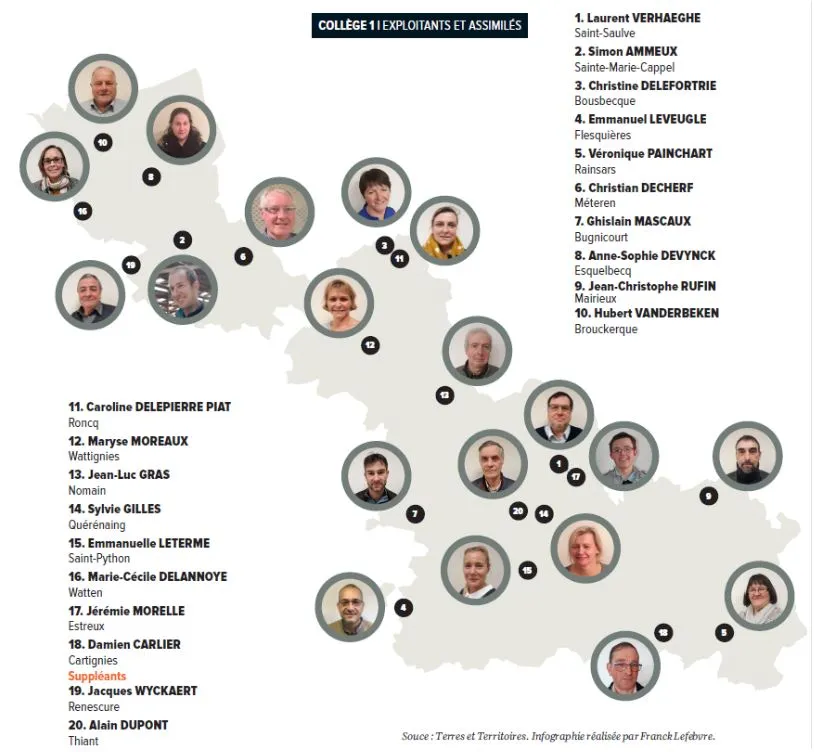 Dans le collège 1, le syndicat majoritaire (avec 26 sièges contre 3 pour chacun des 2 autres syndicats) présente 3 candidats de Sambre Avesnois : Jean-Christophe Rufin, agriculteur à Mairieux, Président FDSEA de l’Arrondissement d’Avesnes-sur-Helpe et Secrétaire Général de la FRSEA, Véronique Painchart, agricultrice à Rainsars, engagée dans le Réseau Le Savoir-Vert avec sa Ferme Pédagogique, tous deux déjà membres du bureau Collège 1 Chefs d’exploitation à la Chambre d’Agriculture Nord Pas-de-Calais, et Damien Carlier, agriculteur à Cartignies, à la FDSEA depuis près de 30 ans.